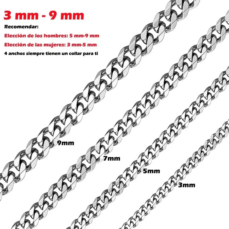 Descubre la elegancia del acero inoxidable con nuestra exclusiva colección de collares. Para él, opta por la audacia con eslabones de 5 mm a 9 mm; para ella, la sutileza de 3 mm a 5 mm. Con cuatro anchos distintos, tenemos el collar perfecto esperándote. Encuentra tu estilo, define tu presencia. ¡Visítanos y selecciona el que te defina!
