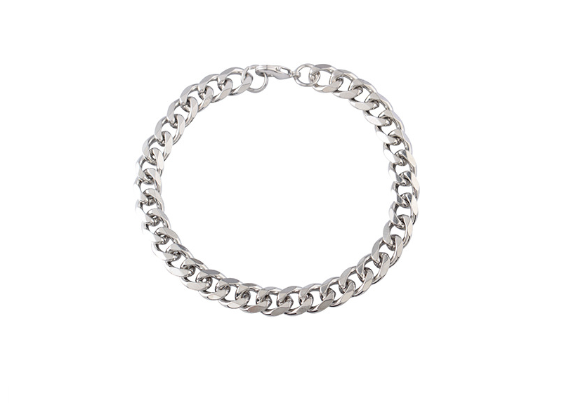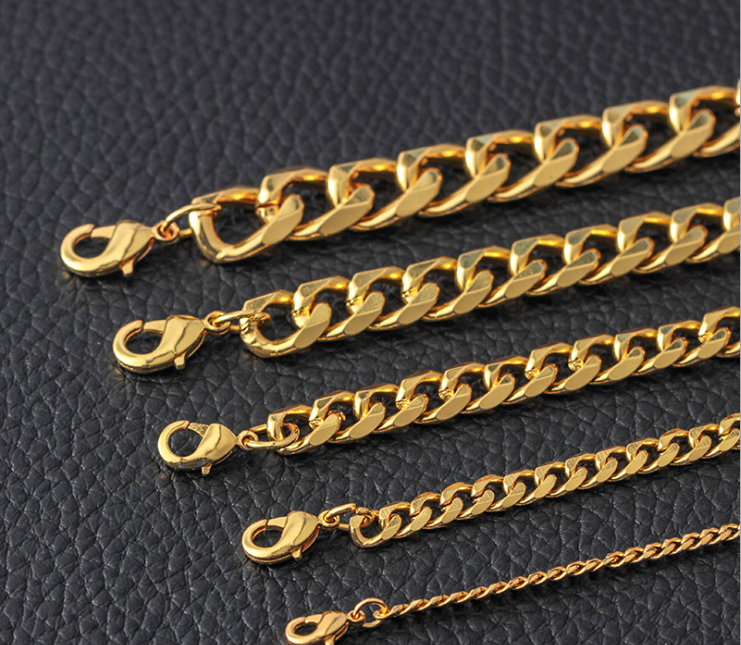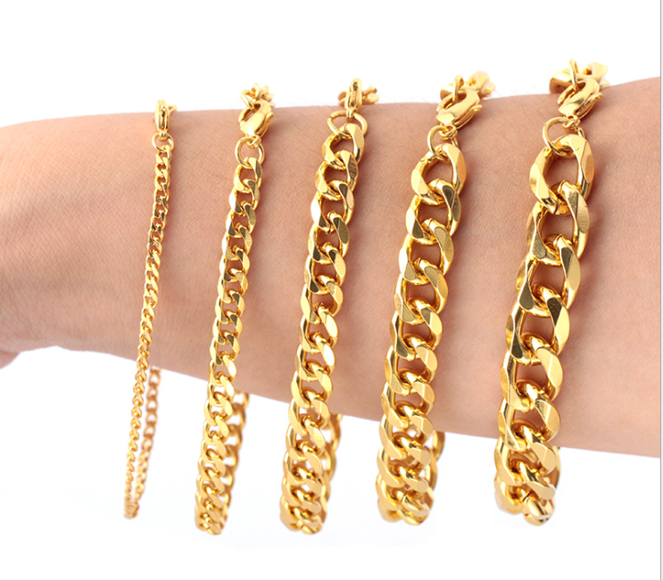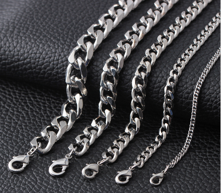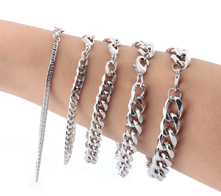 Venta de diferentes estilos de eslabones: los más grandes y gruesos corresponden a diseños más audaces y masculinos, mientras que la cadena más delgada y fina puede considerarse un diseño más delicado, potencialmente unisex o femenino. Todas las pulseras tienen un acabado brillante y están equipadas con un cierre de mosquetón, lo que indica que son duraderas y están diseñadas para un uso fácil y seguro. Estos tipos de pulseras son populares tanto por su durabilidad como por su apariencia moderna y pueden ser usadas tanto en ocasiones casuales como formales.
